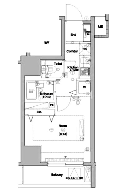 | 間取り | 1K | 専有面積 | 22.61㎡ |