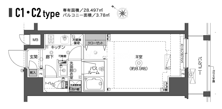 | 間取り | 1K | 専有面積 | 28.49㎡ |