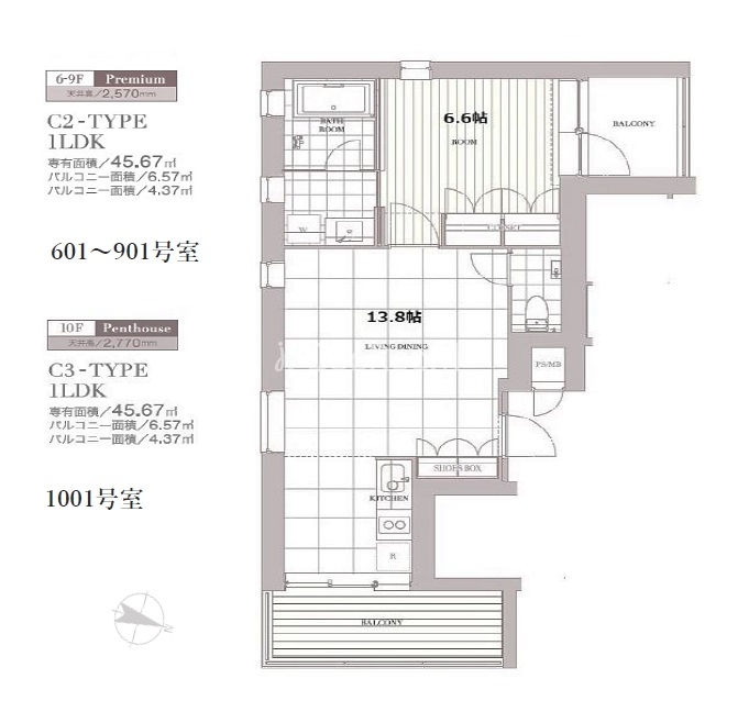 間取り | 1LDK | 専有面積 | 45.67㎡ |