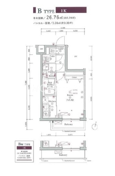 | 間取り | 1K | 専有面積 | 26.76㎡ |