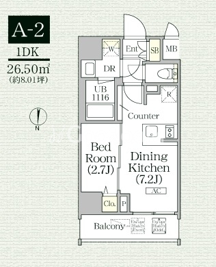| 間取り | 1DK | 専有面積 | 26.50㎡ |