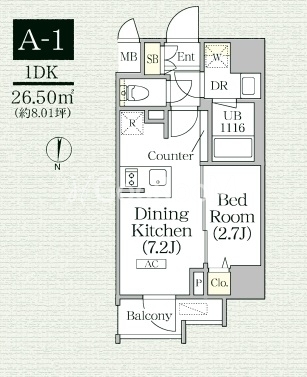 | 間取り | 1DK | 専有面積 | 26.50㎡ |