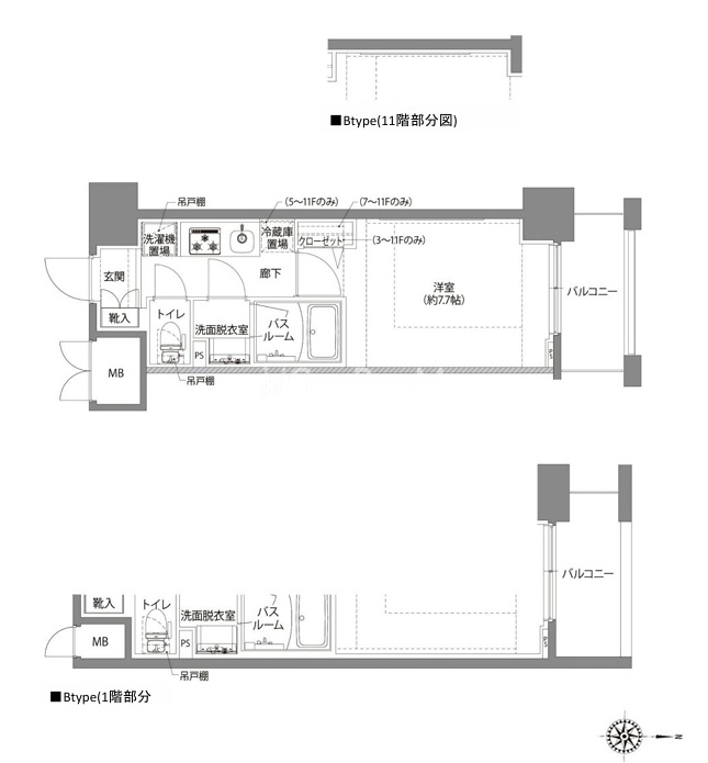 | 間取り | 1K | 専有面積 | 26.61㎡ - 27.05㎡ |