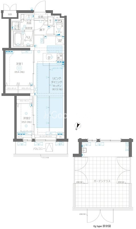 北西向き、 広さ45.67㎡のお部屋です。